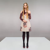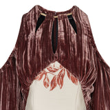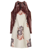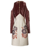 Exposed top shoulder dress with toggled straps for tightening on sleeve tops and around neckline. Red and grey crinkle velveteen fabric on upper dress, and floral jacquard lower part of dress.