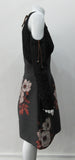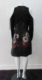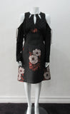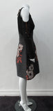 • Black Tie Sleeve Dress. Black floral design print dress with cut-away shoulders and pointed tips at neckline, connected with contrast string. Shoulder strings provide gathering capabilities as well. CB invisible zipper. CB dress length 97cm. 400g approximate weight. 93% Acrylic, 7% Polyester. Contrast: 41% Polyester, 26% Acrylic, 26% Wool, 7% Polyamide. Lining 100% Rayon. Dry Clean Only. Made in England