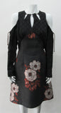 Black floral design print dress with cut-away shoulders and pointed tips at neckline, connected with contrast string.