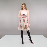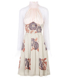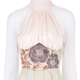 Medium length Collared Corset Dress in pale pink ruched collar and upper bodice. Slight floral design centre panel and pleats below waitline.