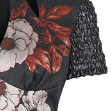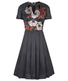 Upper floral tri-point neckline dress in 3/4 length, featuring pleated lower part of dress below waist in black satin.