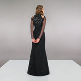 • Tri Point Dress evening gown sheer long sleeve black contrast weave white flower model image photo picture