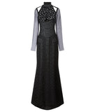 • Tri Point Dress evening gown sheer long sleeve black contrast weave white flower front image photo picture