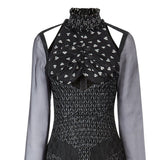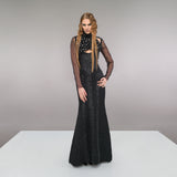 Full length multi-textured black dress featuring faux leather criss-cross paneling and black sheer sleeves. Semi-open top shoulders. Upper bodice has black with white spotted design.
