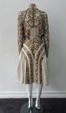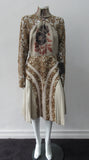 Contrast sequined and beaded gold lace contrast panels. Subtle floral design on bodice.