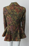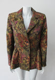 Brass red and purlple textured brocade jacket featuring side hip gathers and 2 button front clousure.
