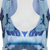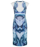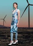 Multi-blue coloured wind turbine print dress with dropped front neck, compensating with sheer white mesh on chest and shoulder tips.