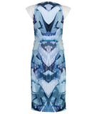• Print Round Waist Dress. Multi-blue coloured wind turbine print dress with dropped front neck, compensating with sheer white mesh on chest and shoulder tips. Turine blade style detail on side hips featuring tri-elastic trim groupings.